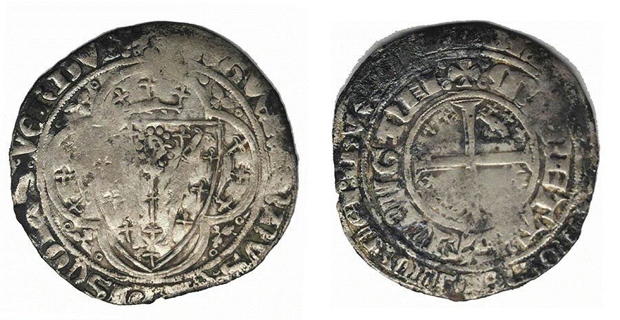 Et voici un autre exemplaire mais avec une variante dans la légende. Avers: +: HVGUENINVS : EPISCOPVS : VERDUN: Revers: + : MONETA : SANPIGNEI : Le poids de cette monnaie est de 3 g |