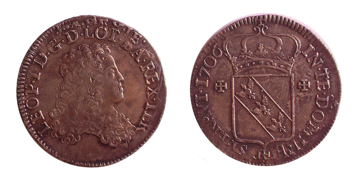 Demi teston 1706 sur flan réformé. Il est d'un poids de 4, 06 g. Le portrait est du même type que le demi teston de 1705, M. Flon ne connait pour cette année de fabrication que le teston sur flan neuf et sur flan réformé. Voici donc une nouvelle ligne à rajouter avec ce demi-teston. Collection particulière Un autre exemplaire a été signalé. En voici l'image. Son poids est de 4.02 g. Merci à Ph. Chaton.