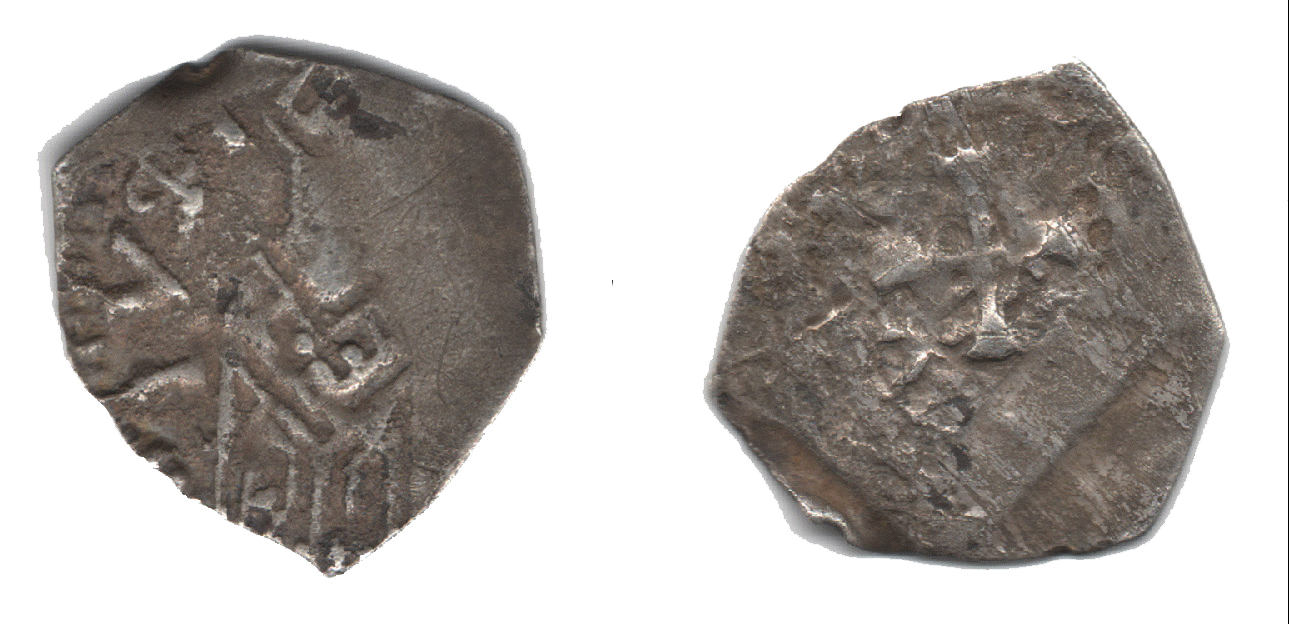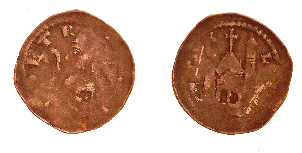 Encore une denier de Pierre de Brixey, poids 1,05g Ce type représentant une église et connu avec un buste tête nue, sur ce type le buste est mitré. (Collection particulière) |