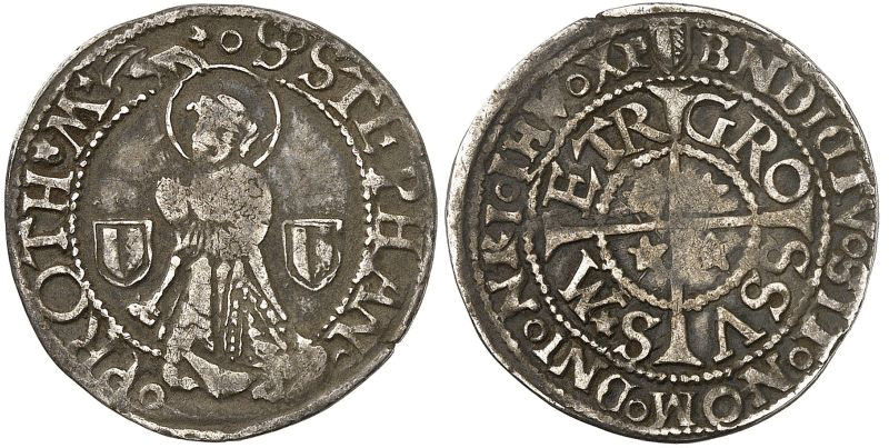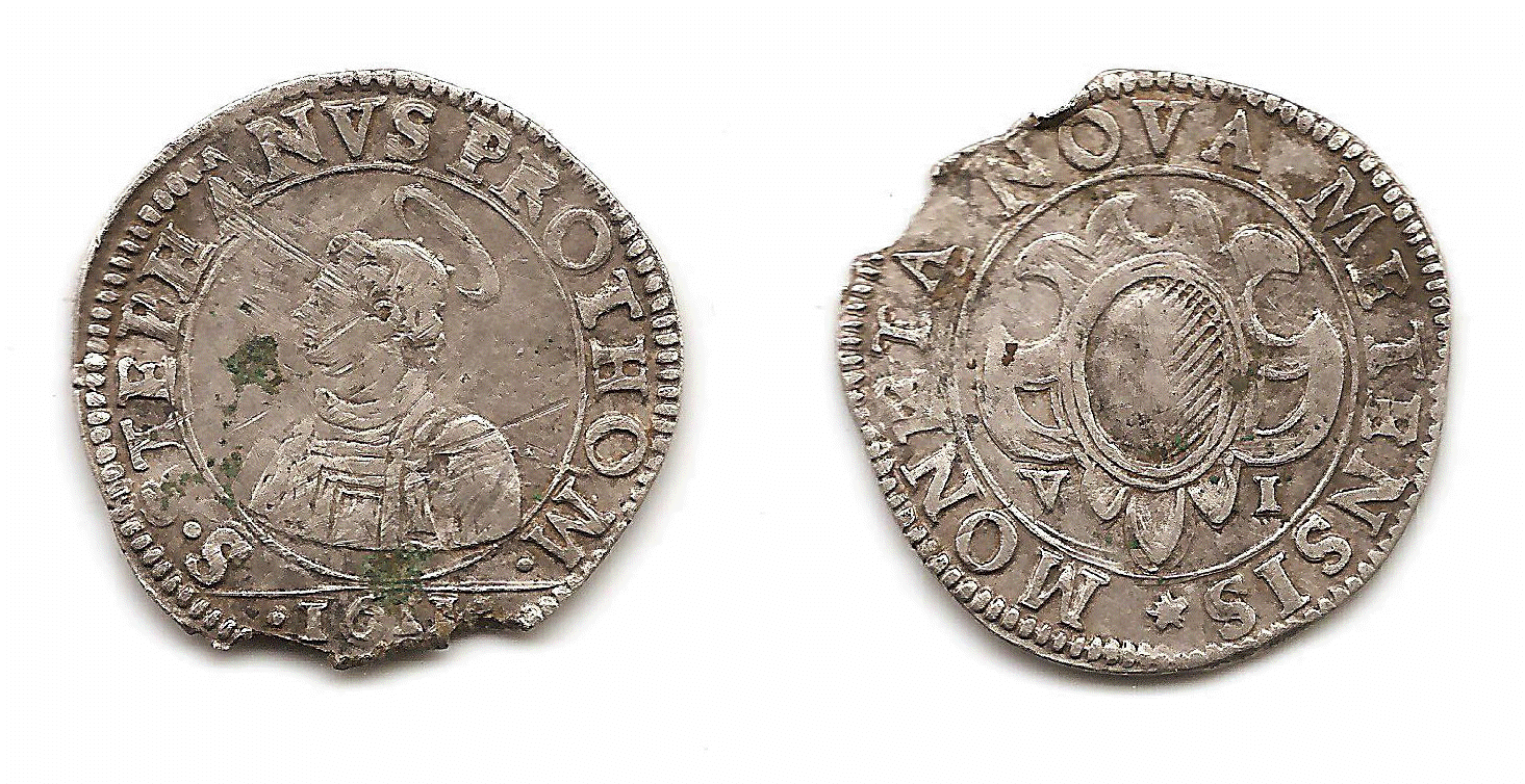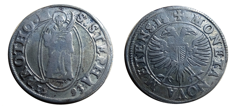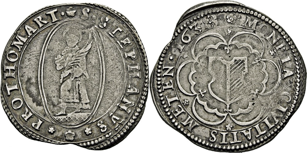 Voici un teston au Saint Etienne debout daté de 1593. Avers : S.STEPHA PRTHO.M 1593 eu pieds du Saint Revers : +MONETA NOVA METENSIS Vu sur le net ________________________________________________